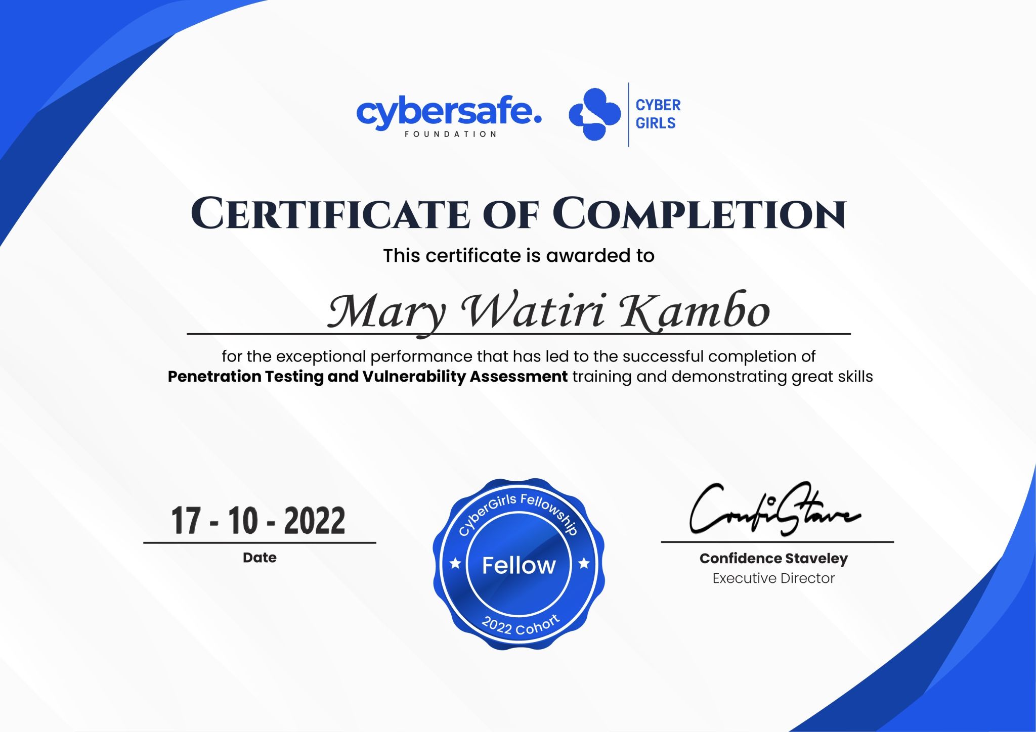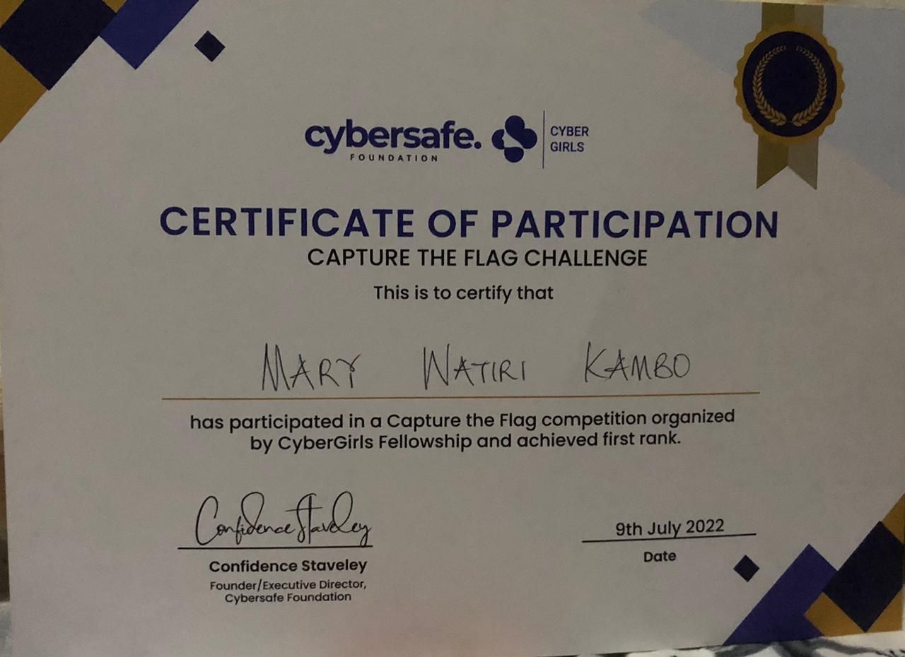In April 2022, I joined Cybergirls, an intensive 7-month training program. It was an exciting opportunity that allowed me to enhance my cybersecurity skills and knowledge. The program was entirely virtual, enabling participants from various African countries to connect and learn together. However, amidst the virtual setup, we had a memorable physical meeting at the Nairobi Linux party. It was a fantastic experience where I had the chance to meet my fellow participants, known as my cyber sisters, and engage in various activities. One highlight of the event was the exhilarating Capture the Flag (CTF) competition. I put my skills to the test and emerged among the top performers, which filled me with a sense of accomplishment. Additionally, I had the privilege of meeting Confidence Staveley, the founder of cybersafe foundation and a renowned figure in the cybersecurity field. Overall, my time with Cybergirls was immensely rewarding, providing me with valuable experiences and connections in the cyber world.